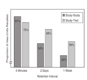 La investigación reciente muestra que las pruebas no solo mejoran el aprendizaje, sino que también reduce la tasa de olvido. Roediger y Karpicke (2006a) descubrieron que dedicar un tiempo a una combinación de estudio y pruebas, en lugar de solo al estudio, redujo el rendimiento en una prueba realizada cinco minutos después, pero mejoró el rendimiento en una prueba realizada una semana después (Figura 1). En dos estudios en los que se retrasaron hasta 42 días la realización de la prueba, la tasa de olvido también se retrasó (Carpenter, Pashler, Wixted y Vul, 2008)