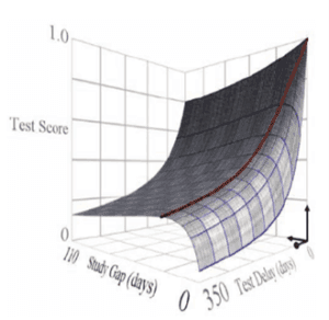 Los resultados revelaron una superficie con forma de silla de montar que muestra que el intervalo óptimo de estudio está relacionado con el retraso en la prueba (Figura 3). El intervalo óptimo parece ser una proporción que disminuye lentamente en función del retraso de la prueba, pero para propósitos prácticos, un intervalo de aproximadamente el 5 % al 10 % del retraso de la prueba es ideal.