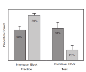Esta falta de reconocimiento de la superioridad de las estrategias como las pruebas, el espaciamiento y el intercalado puede deberse a que estas, aunque benefician el desempeño en pruebas posteriores, tienden a generar más errores durante las sesiones de aprendizaje (Schmidt & Bjork, 1992). Por ejemplo, en el estudio de intercalado realizado por Rohrer y Taylor (2007), la práctica intercalada mejoró el desempeño en pruebas finales, pero redujo la precisión durante las sesiones de práctica (Figura 4).